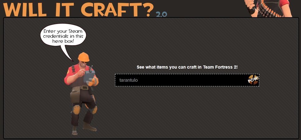 Oficialiame TF2 bloge buvo aprašyti du savotiškai įdomūs puslapiai, kurie atlieką tą pačią, patarėjo „craftinimo“ klausimais, funkciją. Jums nukeliavus į vieną šių puslapių ir nurodžius savo Steam profilio URL (jį rasite Steam/Community/Profile pvz. http://steamcommunity.com/id/Tarantulo), gausite sąrašą galimybių, ką galima pagaminti iš jūsų kuprinėje turimų daiktų. |