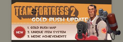 Jis ateina! Jis čia! Vaikai šaukia, suaugę vyrai verkia džiaugsmo ašaromis, likę žiūri apstulbę: tai juk pirmasis didysis Team Fortress 2 atnaujinimas! Na, gal kiek perdedu, tačiau Team Fortress 2 (toliau: TF2) žaidėjai tikrai džiūgavo. Juk TF2 sulaukia tiek daug naujovių: naujas žaidimo režimas Payload, naujas žemėlapis Gold Rush, naujas Meet the Team filmukas ir, žinoma, 36 nauji mediko pasiekimai!