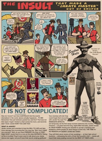 Savaitės rinkinukas #9 Tiems kas pasigedo #9 savaitės rinkinuko, tiesiog šis didžiulis atnaujinimas užgožė visą žaidėjų, tiek tinklapio dėmesį. Taigi jus nukeliamas į kitą savaitę. O čia, šis tas kompensuoti už praleista rinkinuką. Komiksas pagal kurį buvo nupieštas TF2 Jarate komiksas. Valve orkestro TF2 muzika Kartu su šiais atnaujinimais atkeliavo dar keletas melodijų, kurias girdėsime pagrindiniame TF2 meniu. Jeigu dar jų negirdėjote, siūlau pasiklausyti.