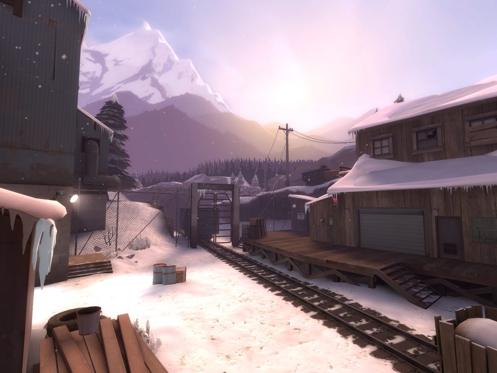 Viaduct is an all-new map especially built for KotH, set outside of the entrance to a secret underground base. Viaduct is also the first Team Fortress map to take place during a snowfall (not counting Acegikmo’s awesome cp_glacier map, or for that matter all the other community mappers who manage to think up and execute on all the cool stuff before we even think of it). Both teams start at the base of a low hill, and will have to climb to get to the capture point at the hill’s peak. The various elevations of the map and multiple routes to the central point guarantee some frenzied battles as the point changes hands during gameplay.